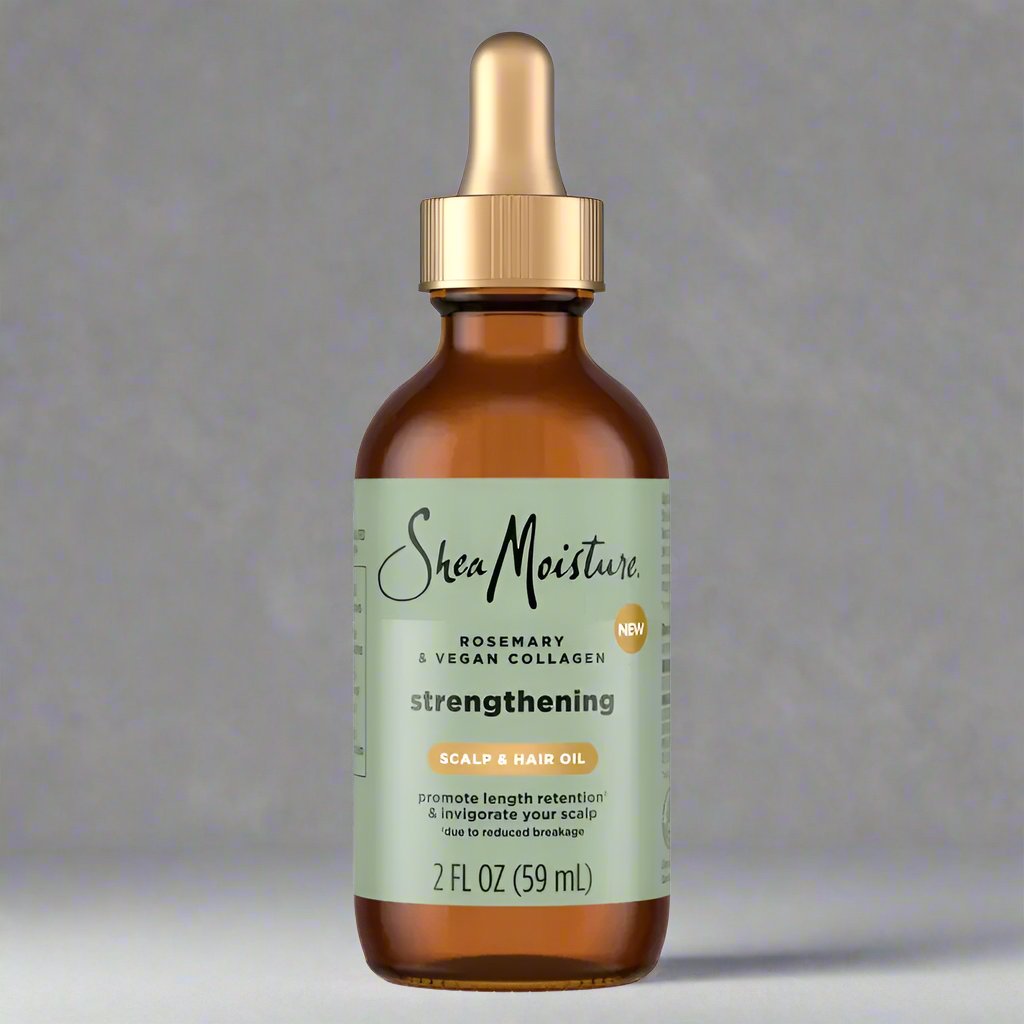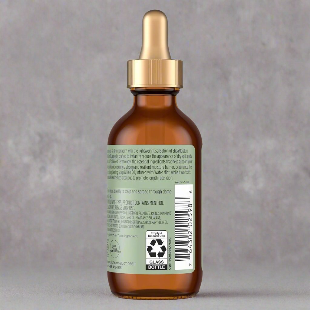 SheaMoisture Strengthening Scalp Hair Oil er designet for å styrke hodebunnens fuktighetsbarriere og redusere hårbrudd, noe som fremmer lengdebevaring og sunnere hår. Oljen gir 2X mer fuktighet til håret og reduserer synligheten av tørre, flisete tupper. Den inneholder rosmarinolje og vannmynte for å gi næring til både hår og hodebunn, og etterlater håret sterkere og mer spenstig.